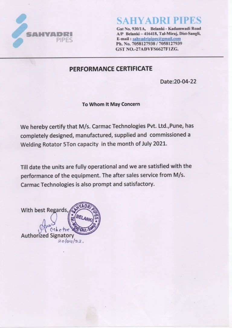 We would like to introduce our company “CARMAC TECHNOLOGIES PVT. LTD” as one of the leading companies involved in the Design, Manufacture, Supply, Erection & Commissioning of the complete range of Welding Manipulators and Material Handling Systems in India.